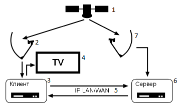 Имеется сигнал с спутника "1". Сам же спутник "1" располагается на геостац. орбите и после того как информация, поступившая с передатчика, принимается - тут же передает его на некоторую часть земной поверхности. Эта територия имеет название зона покрытия спутника. Исходя из того, что спутник шлет данные на определенную обширную територию - делаем вывод, что нельзя вычислить в каком месте идет прием сигнала. Кодированный сигнал, который посылает спутник, улавливает Ваша спут. тарелка "2" и через конвертер (включаятакже переключатели, позиционеры и т.п.) шлет на тюнер или DVB-карточку "3". При работе с офф карточкой доступа, которая (как и надо) вставлена в картоприемник ресивера, происходит следующее: тюнер каждые 5-15 сек. берет с потока шифрованых данных код и отправляет на карту, она в свою очередь его декодирует и обратно отсылает (эта связка вставляется в поток и происходит открытие закодированных каналов на 5-15 секунд). При использовании шаринга весь процесс выглядит чуть-чуть иначе. Пользуясь же кардшарингом клиенту не надо покупать карточку доступа, но требуется активное постоянно соединение интернет "5" (по которому и будут передаваться ключи) для обратной связи с сервером "6" шаринга. Тюнер или DVB-карточка каждые 5-15 секунд выбирает с потока данных запрос и отправляет в виде CW-ключей на сервер шары, который имеет активную карточку доступа, она же раскодирует ключ и сервер отправляет его в виде DW-ключей в поток.